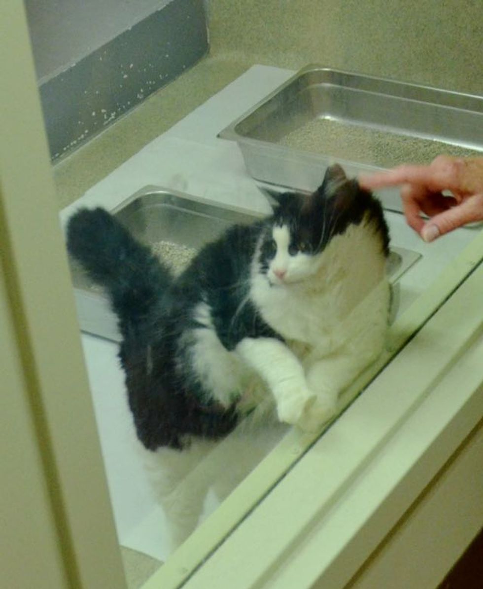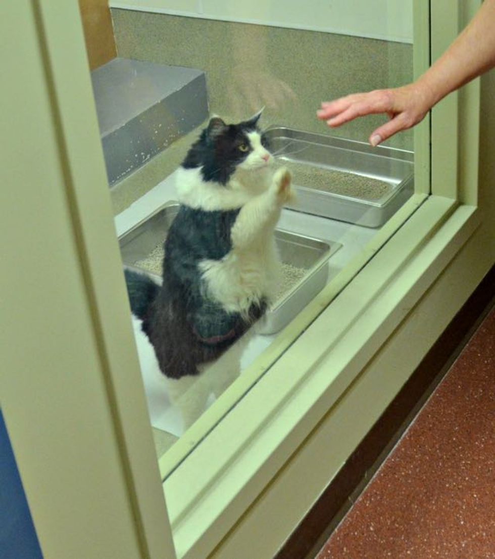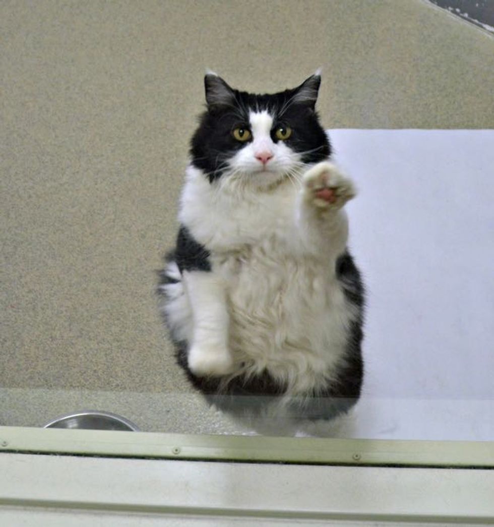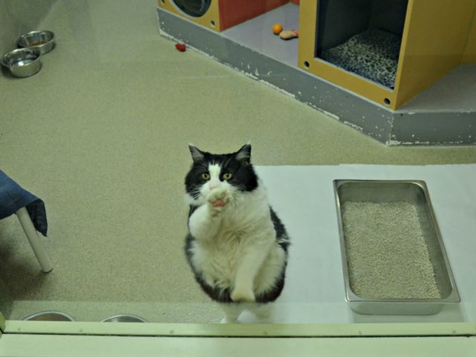 Sienna the 13 year old the black and white cat asks for attention whenever someone walks by.When you walk into the cat sanctuary, this is probably what you will see - a friendly furry friend runs up to you and paws at the glass wall to get your attention.