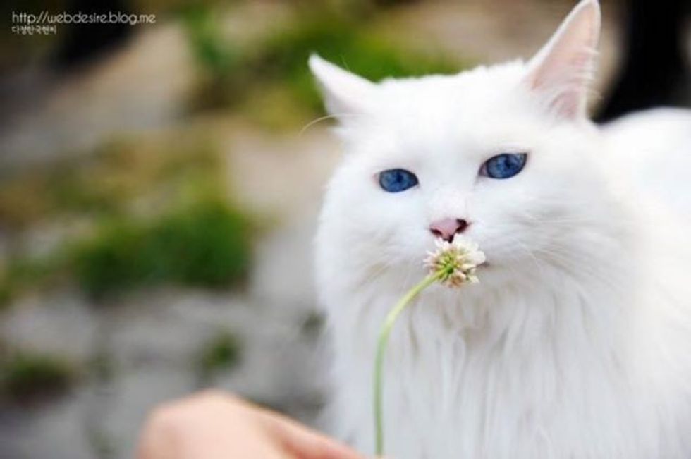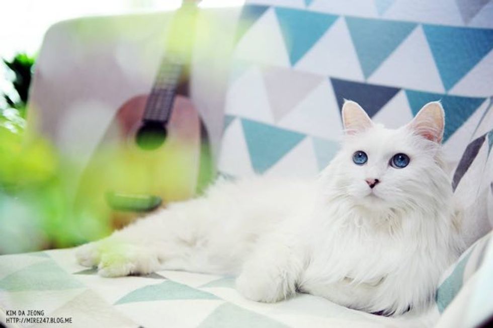 This beautiful Turkish Angora has the most gorgeous blue eyes I've ever seen. They look as if he has the entire universe in his eyes. His name is Yaro, the oldest cat in his family of four furry kitties (Kun, Bogsun and Kaya)