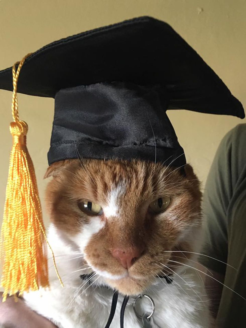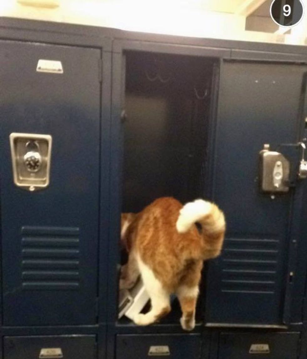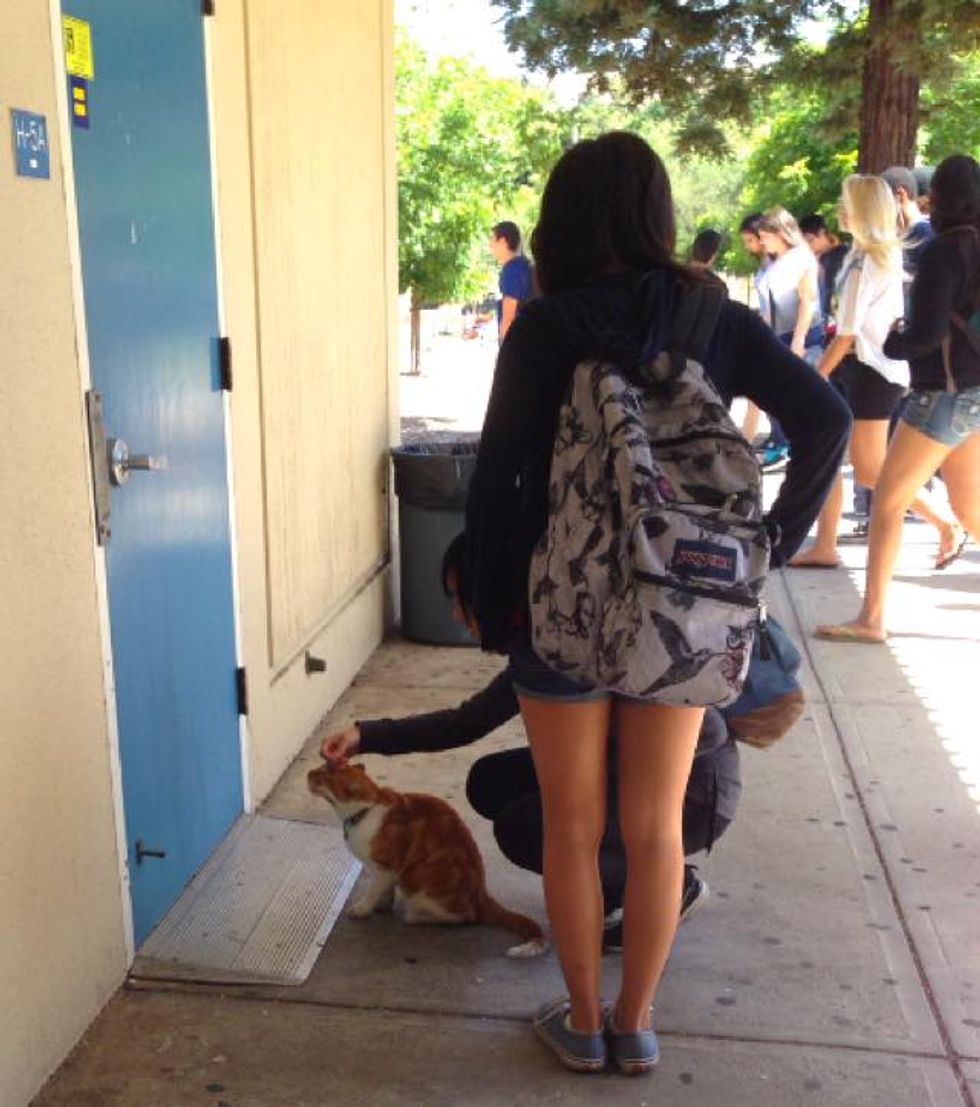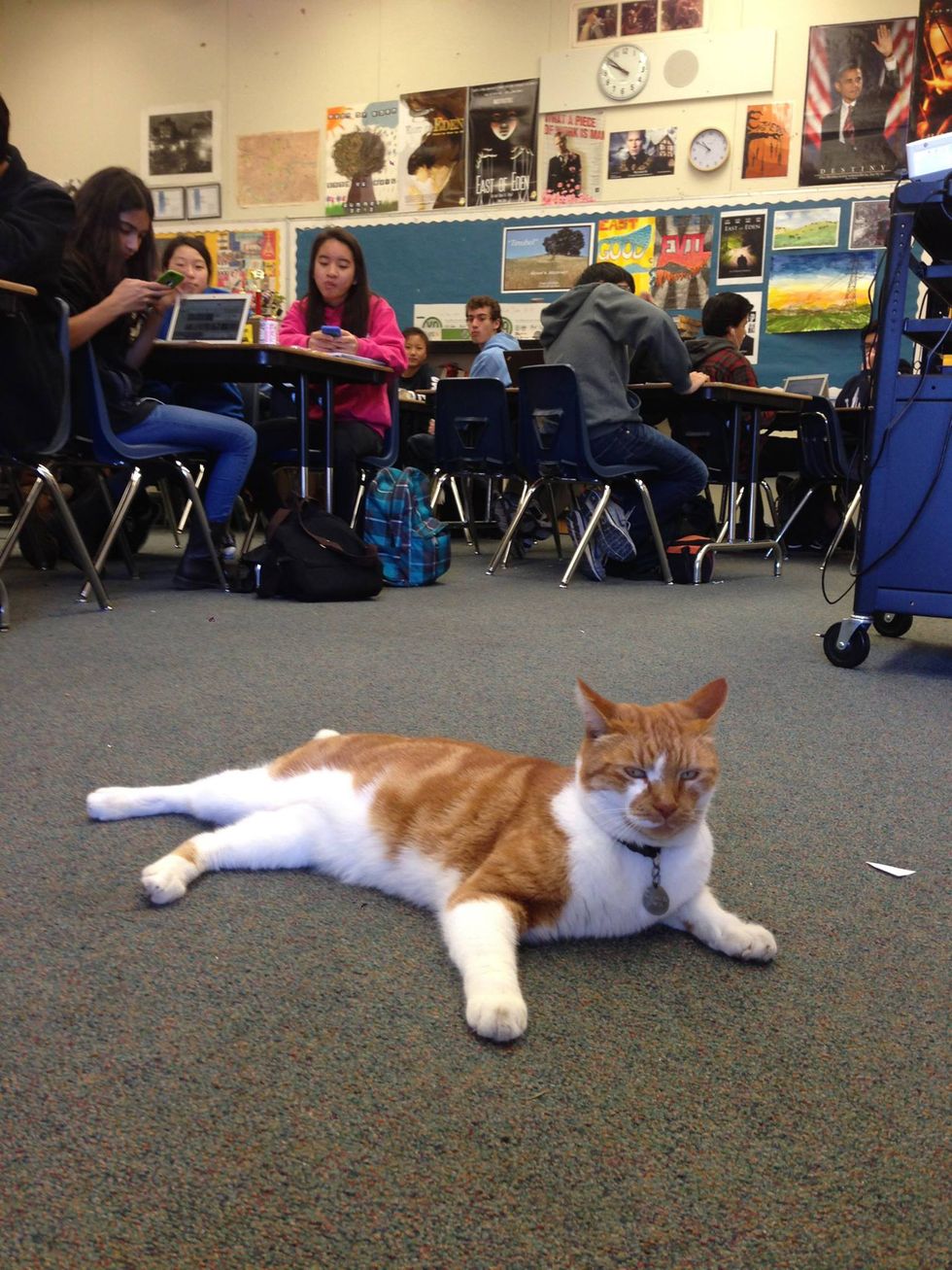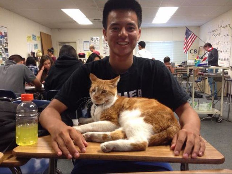 This ginger cat is not your ordinary house cat. Nothing makes him happier than going to school and attending classes. In fact, he's earned his own student body card and become the official campus cat at Leland High School in San Jose, California.