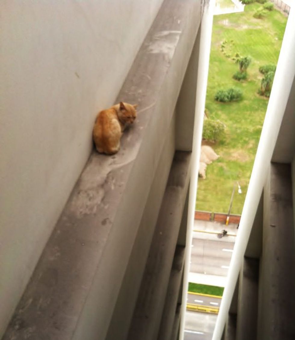A stray cat somehow got on the ledge of a 20 story apartment building. When a couple spotted the ginger feline, they dropped everything behind and went to his rescue.