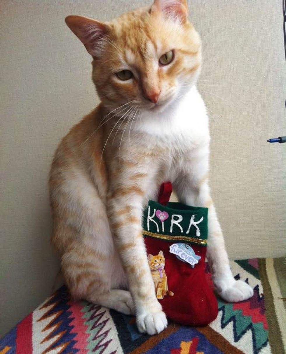 Captain Kirk's first Christmas with his new family. "He was a very good kitty and got many Christmas presents"