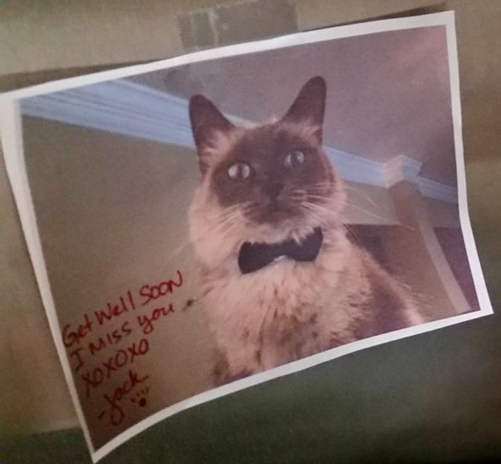 This cat received a picture and a heart warming message from her best furiend Jack when she was hospitalized at the clinic.