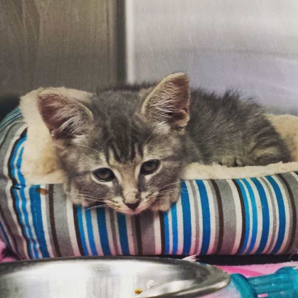"He was found on the street and they didn't think he was going to make it through the night. The vet brought him to their house to give him 24 hour care. He made it through the first night but grew attached to the hippo."