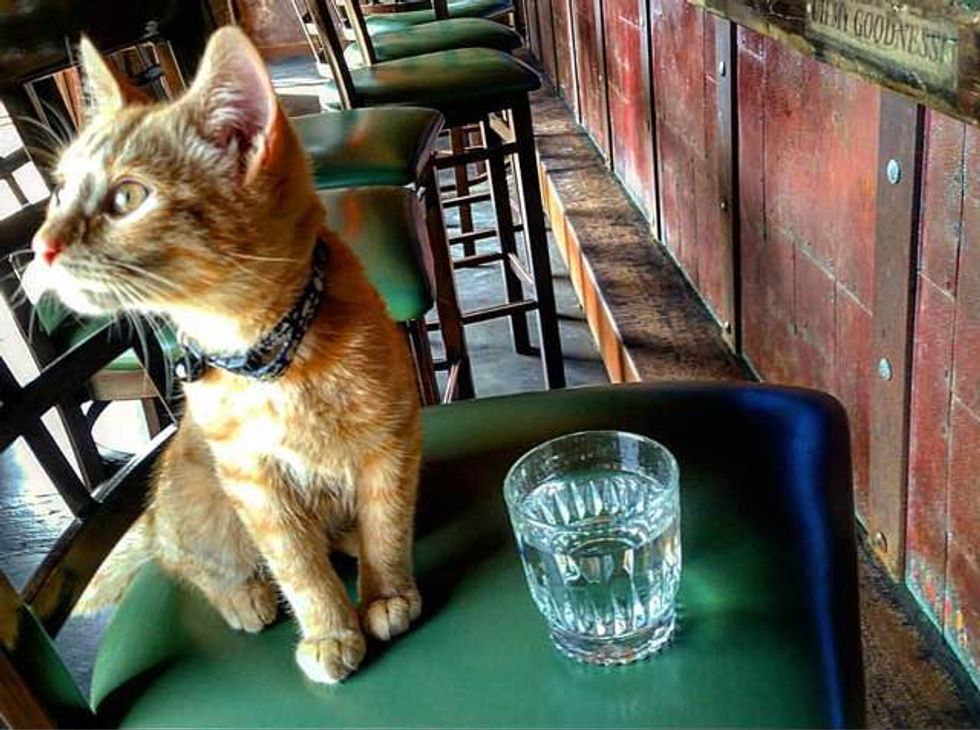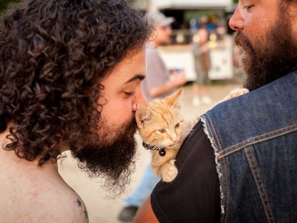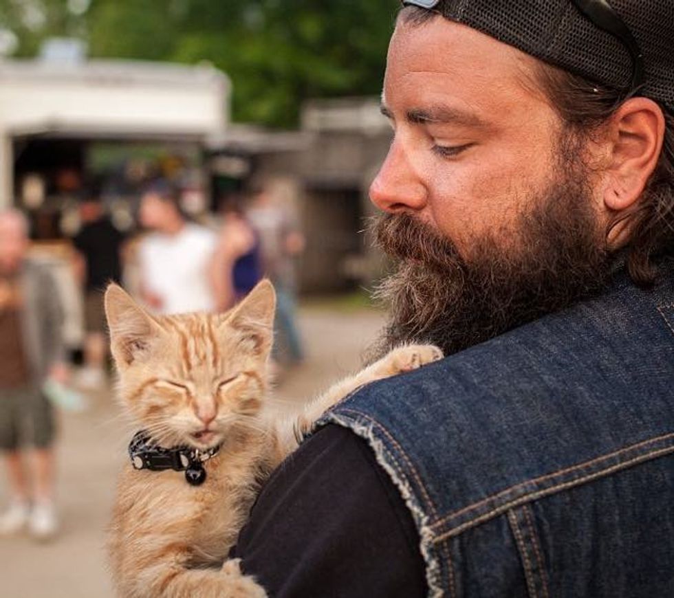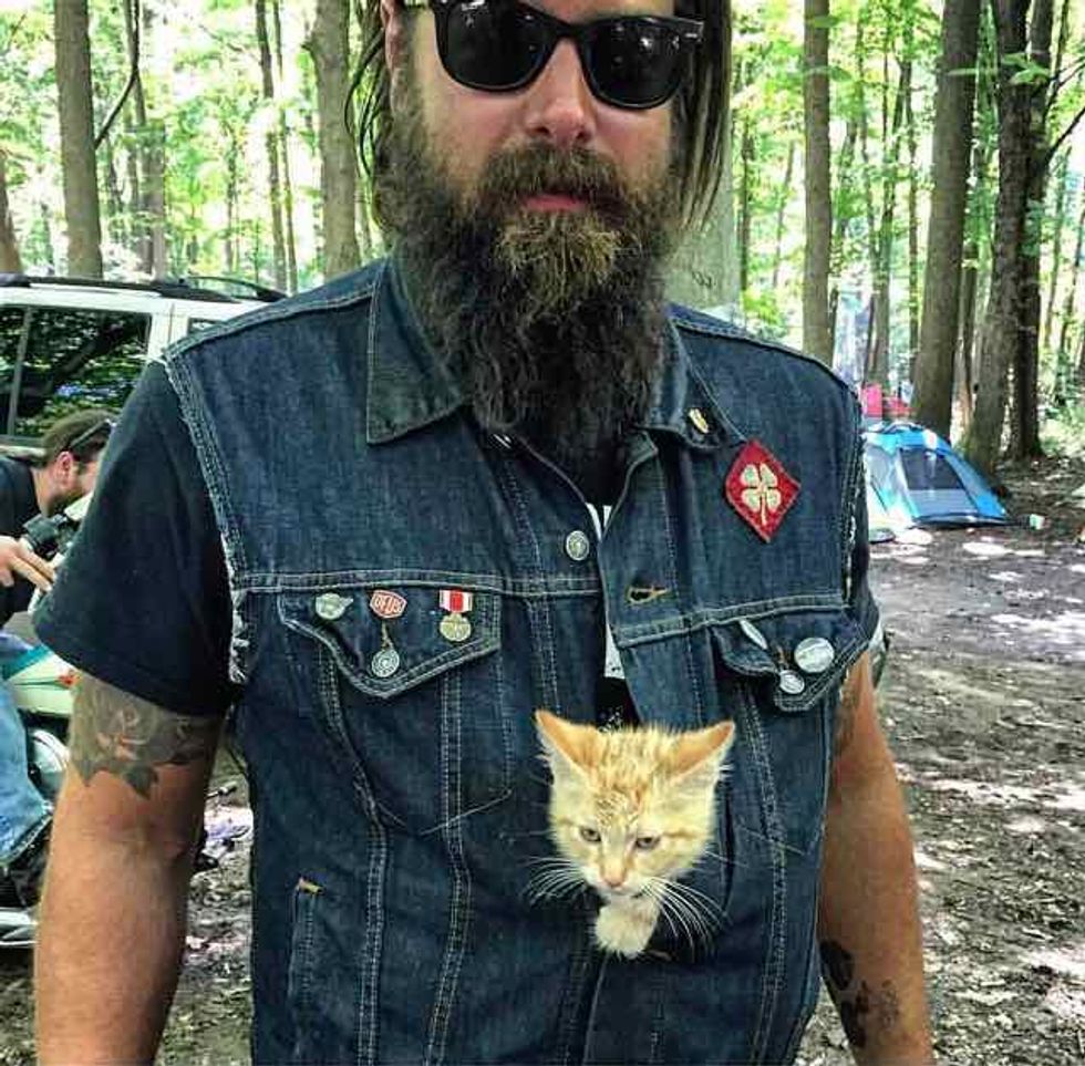 He's so chill. He just hangs out in my vest when we get on the road. I've never met a cat so calm." They named the little buddy Party Cat.