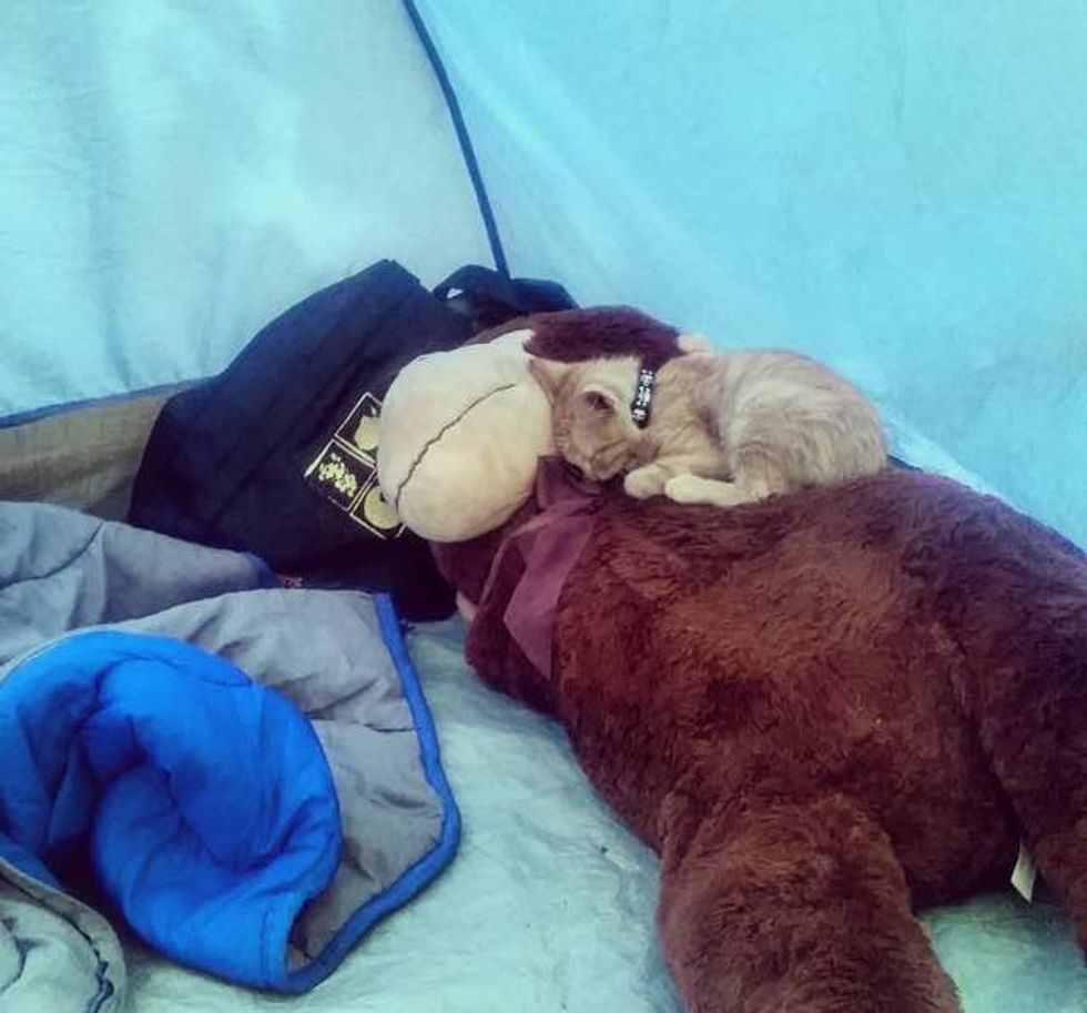 After a long day of playing, Party Cat is all tuckered out on his monkey that they bought on the road.