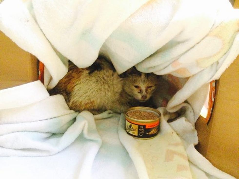 When they spotted the emaciated kitty, they went into rescue. Once the kitten was coaxed into the box with a large blanket, they got on their way to bring the kitty to their home.