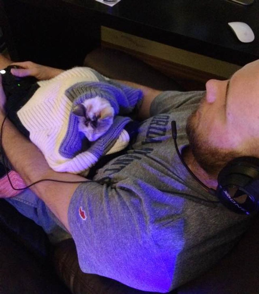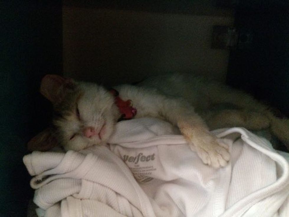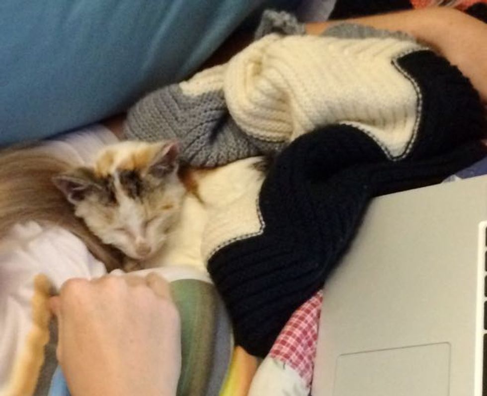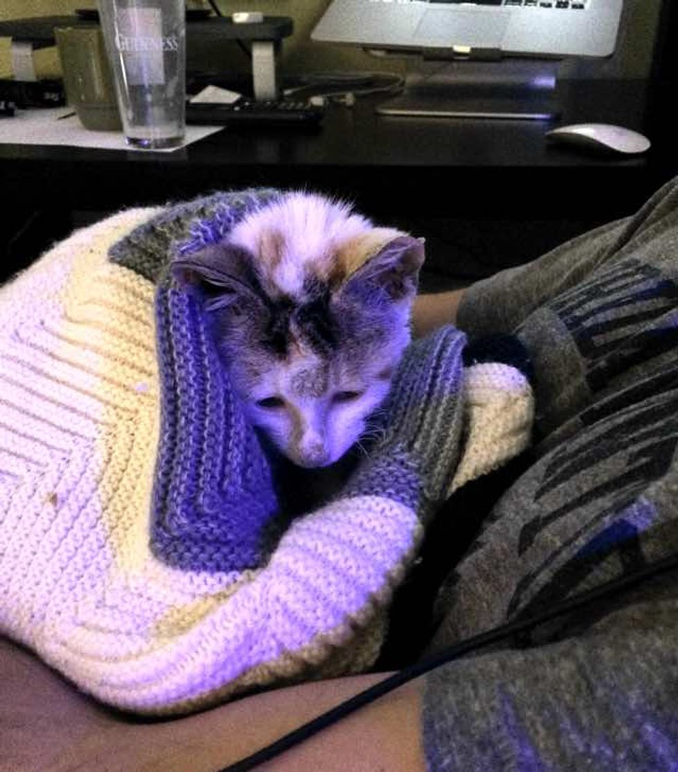 They wrapped her up in a sweater to keep her warm and cuddled with her all night. The kitty named Lulu started to perk up while she was snuggling in their arms.