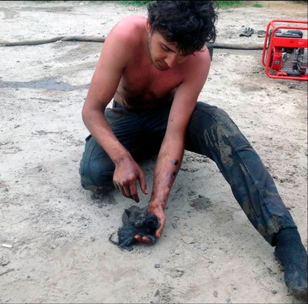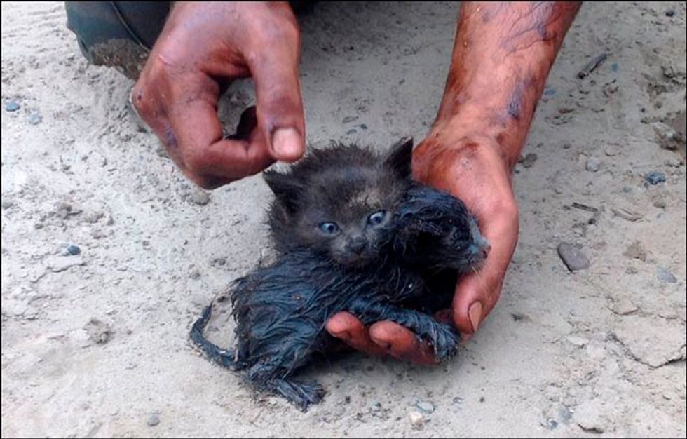 Anatoly Tuptey, a local resident, who was working on fighting the spread of the oil, heard faint cries of the kittens near a country house that was affected by the pollution.