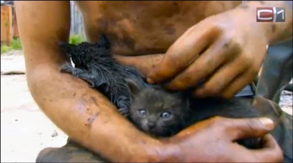 Two tiny kittens were rescued from drowning by a kind young man after they were caught by a deadly oil spill in Russia.