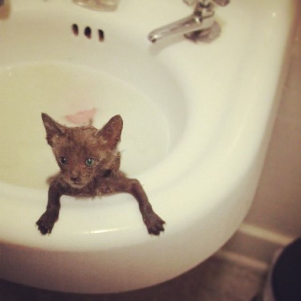 "(I) went for a jog and found this little guy with his eyes sealed shut from an infection," said dmitrigreene via imgur. "I gave him a bath, but he was so dehydrated he was trying to drink the water."