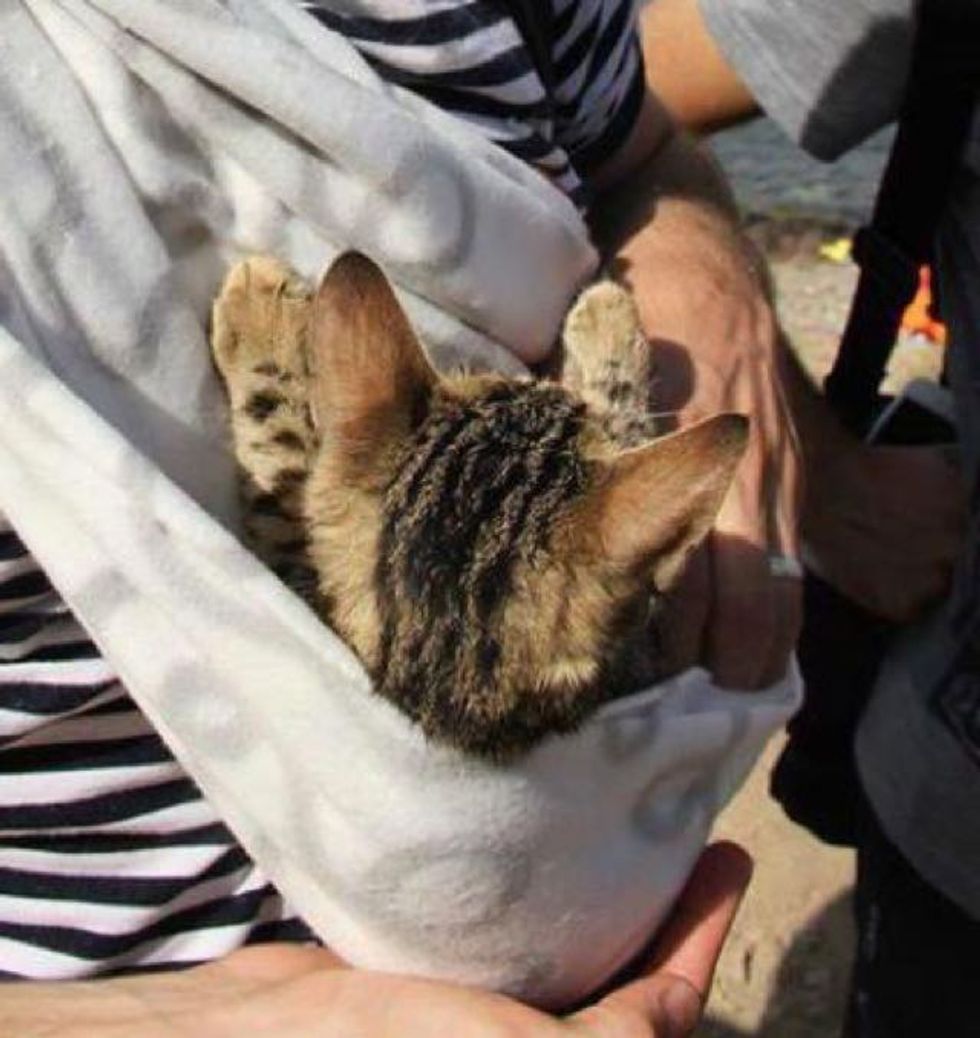 The Syrian family travelled on a boat and made it safely to Lesbos, Greece. The man kept his kitten cradled tightly to his chest throughout the journey.