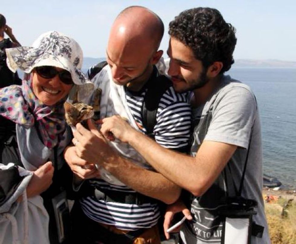 The man seen cuddling the kitten was not willing to make this journey without his kitten, Zaytouna, who'd be lost without him.