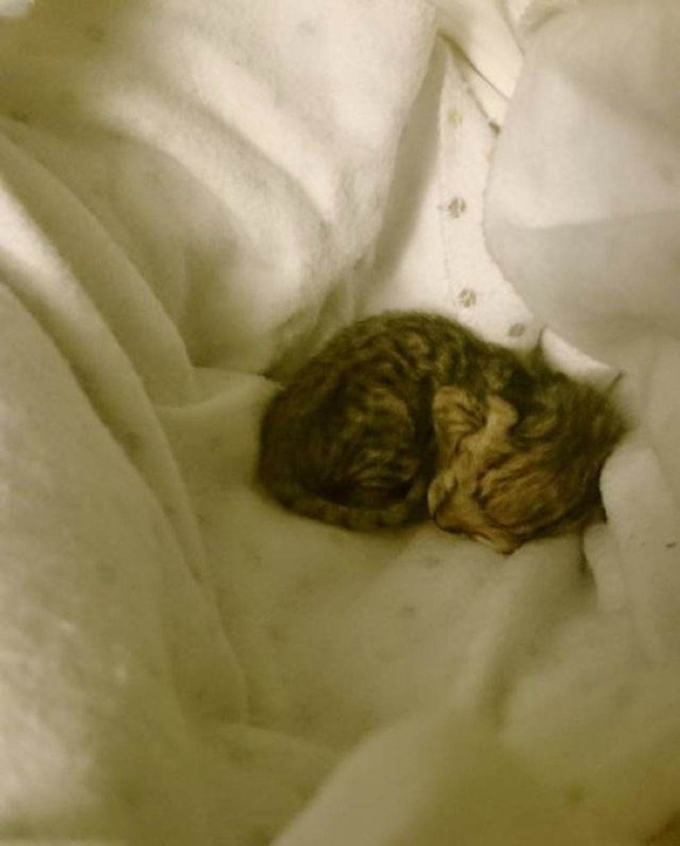 She and her boyfriend started taking turns to care for the kitten, feeding her every hour, keeping her warm and comfortable.