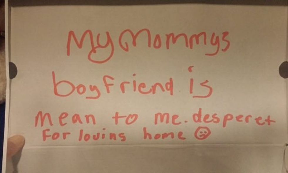 Here's the note: "My mommys boyfriend is mean to me. desperet For loving home :("