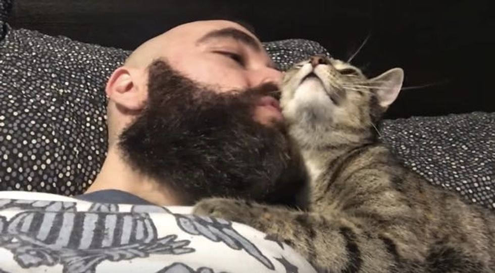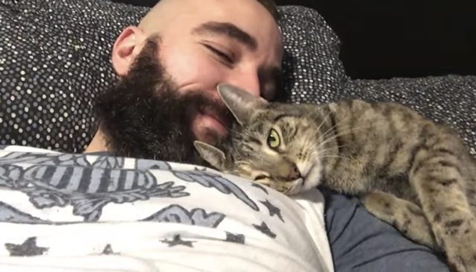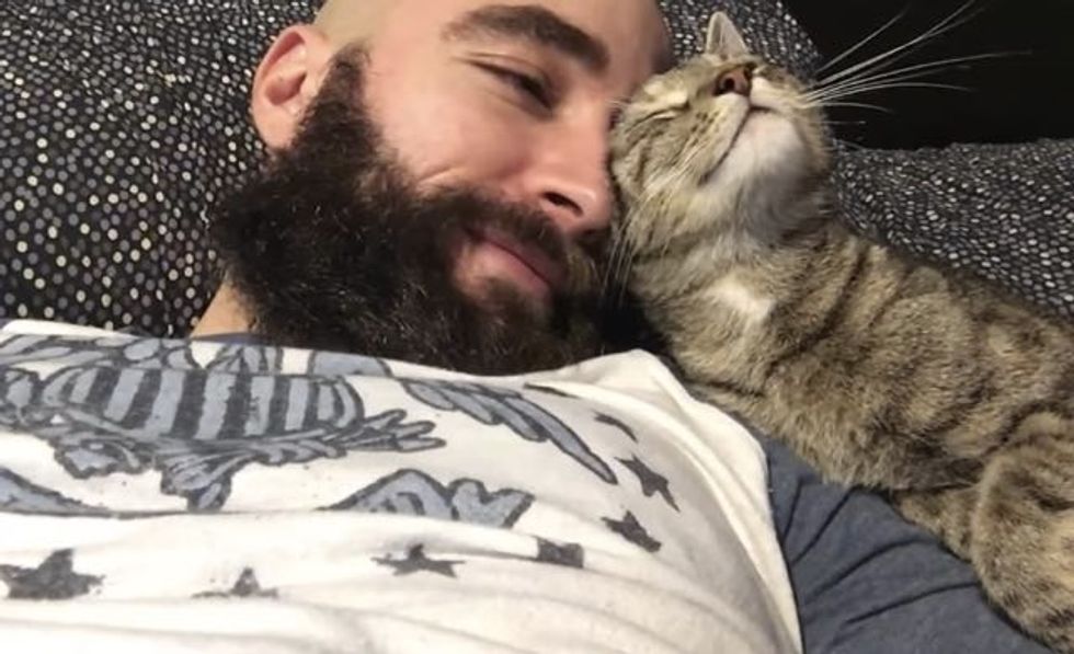 A tabby cat is waking up his human with love and snuggles. He gently nuzzles his face for a kiss and puts his paw on his shoulder to give him a big hug.