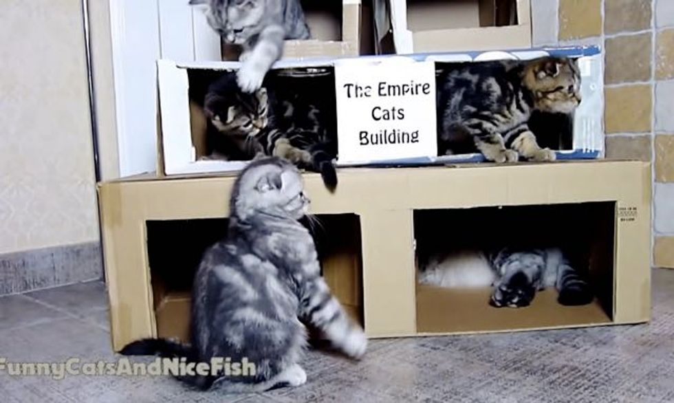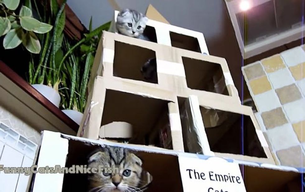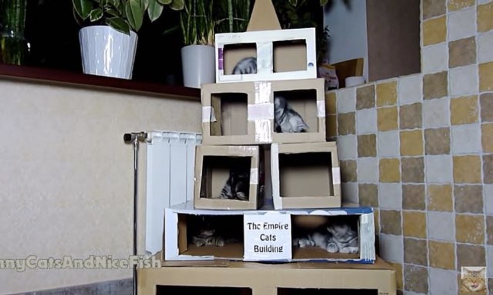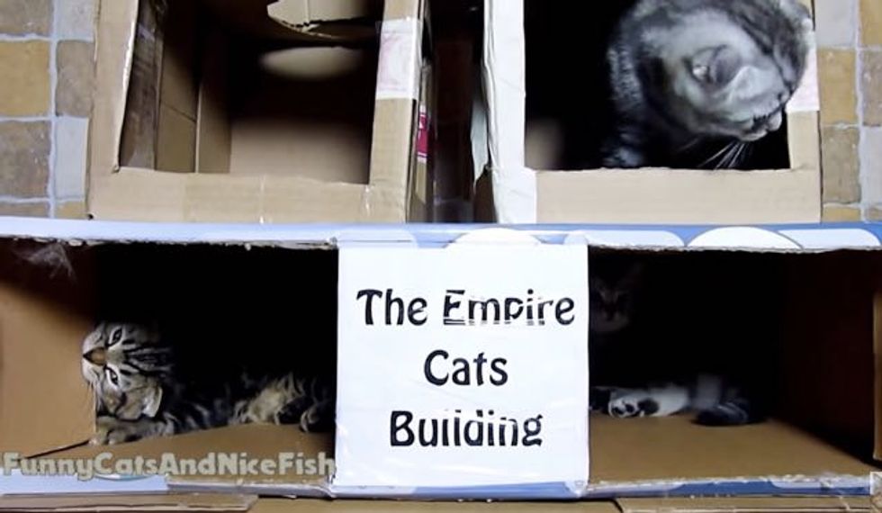Instead of a Christmas tree, these kitties got something different this holiday season. Their human built a 5-story tower made from pure cardboard and named it 'the Empire Cats Building'!
