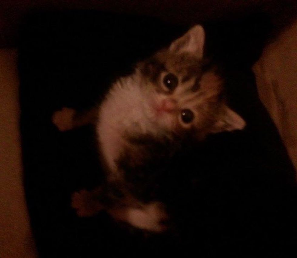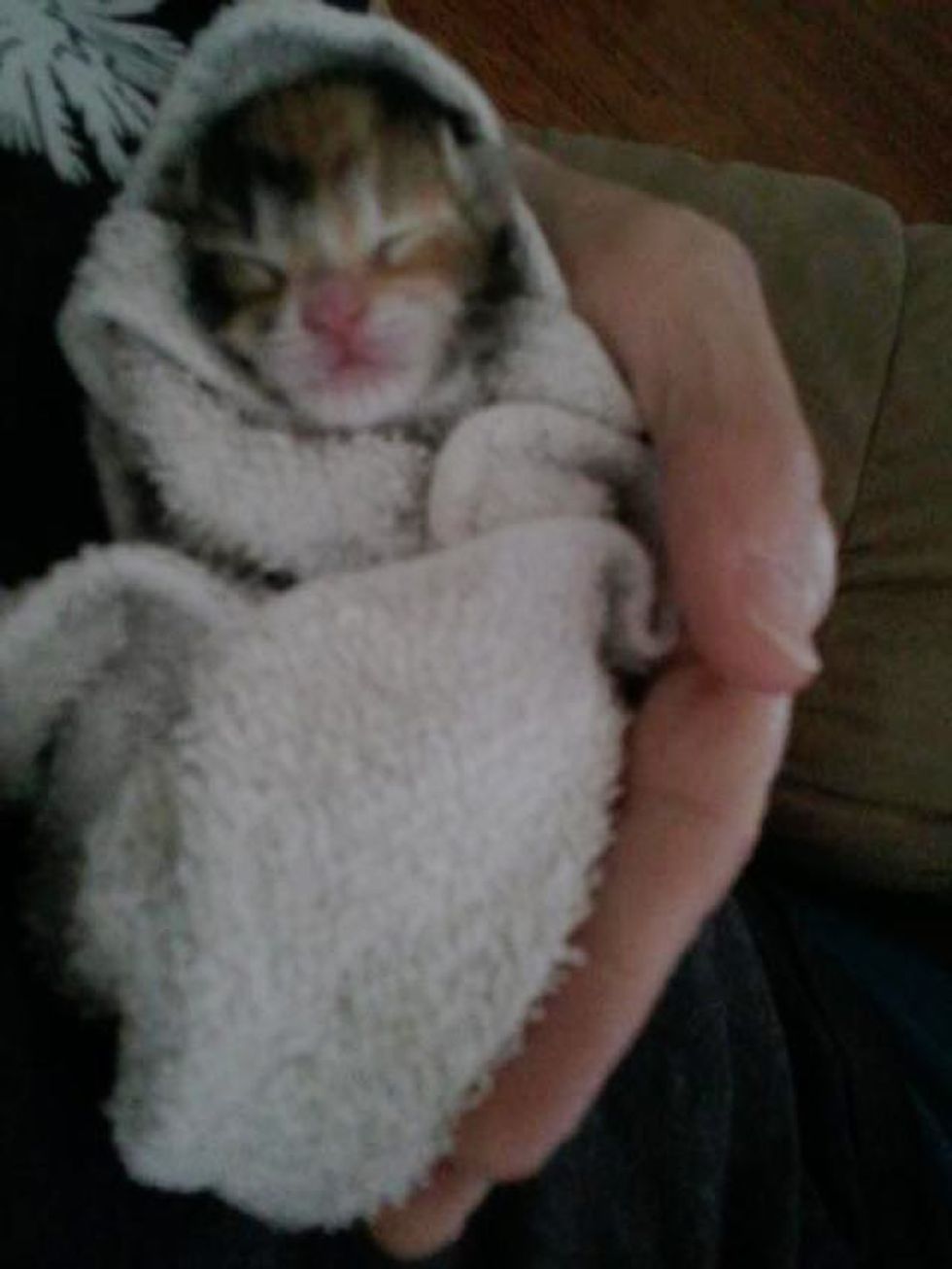 She got the kitten, who was cold and damp from the bushes being located in a ditch and the previous rain we had earlier that day, she wrapped her in an old T-shirt and brought her home to me.