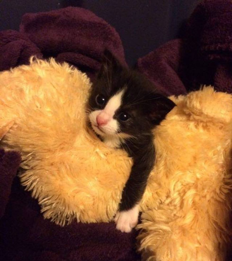"Some family friends found this little 2 week old kitten (guesstimate) in a field behind their house. Knowing we foster bottle babies for the local humane society, they called and asked if we could help the little guy. We of course said yes," Jamie Myers told Love Meow.