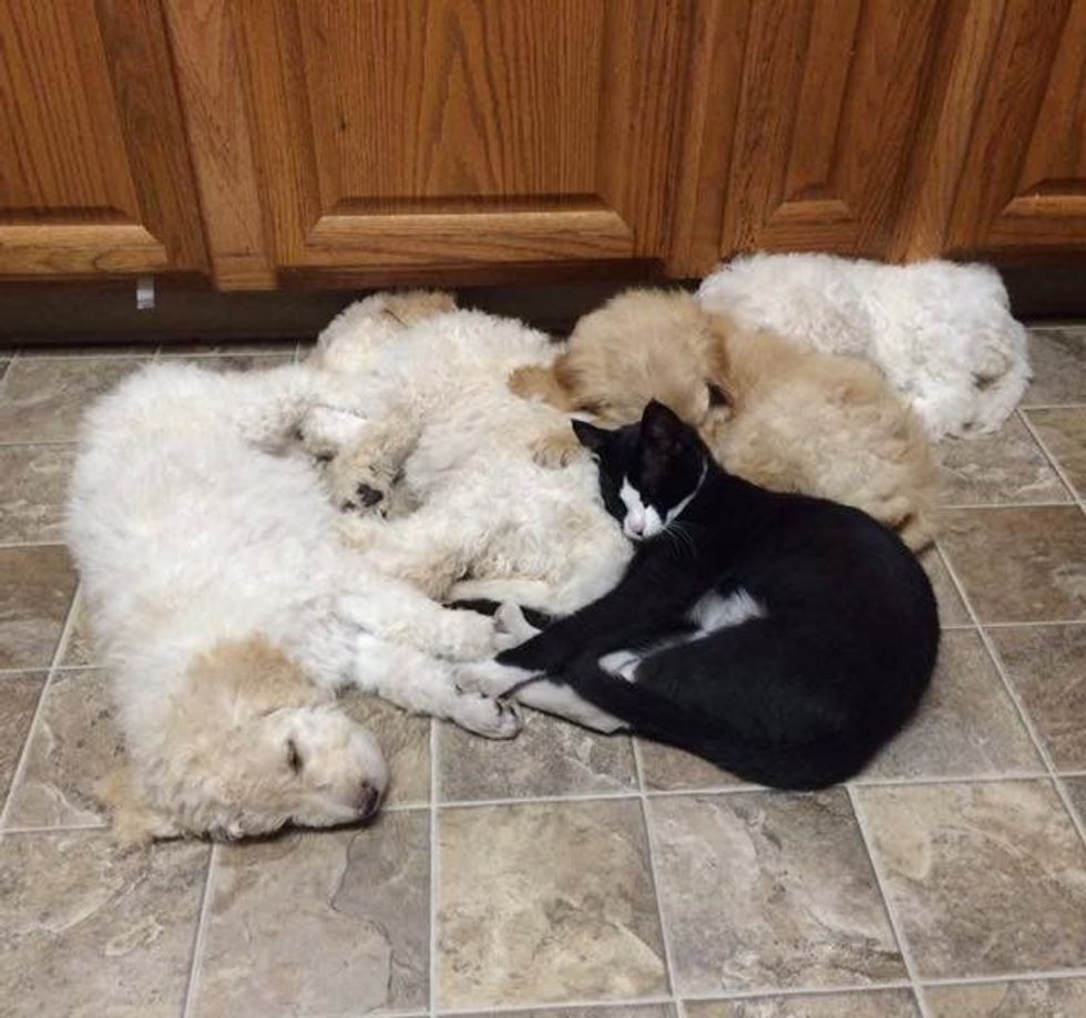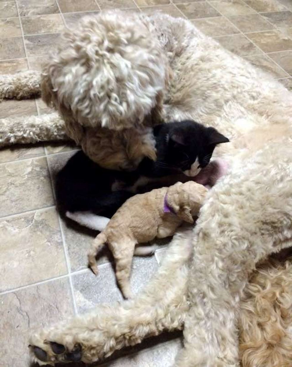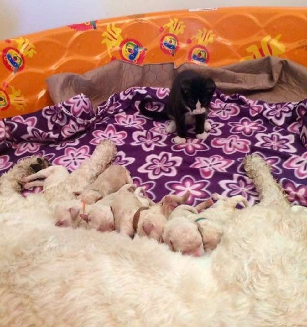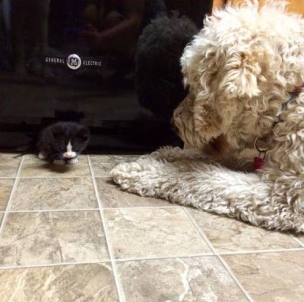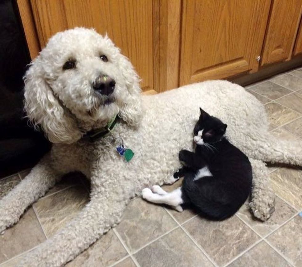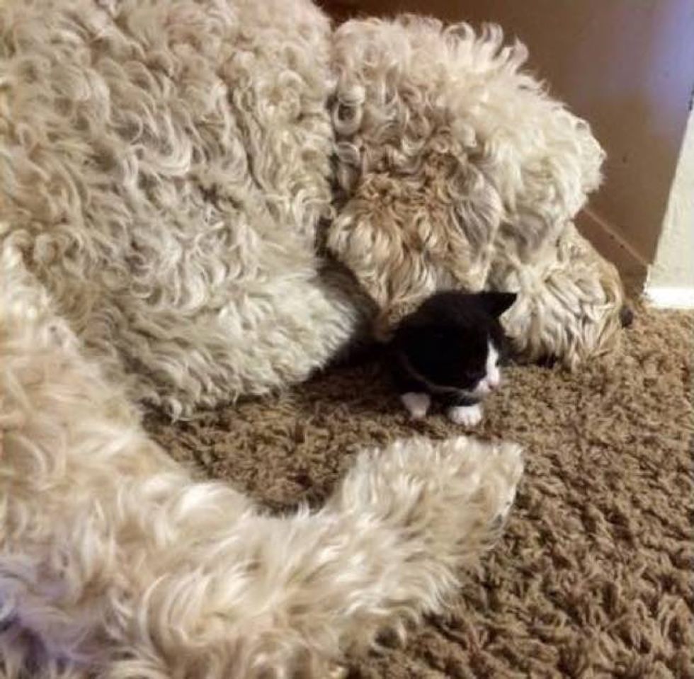This little tuxedo kitten was found without a mom, but soon that was about to change. When a pregnant dog saw the little kitten in need of motherly love, she took to him and started raising him like her own.