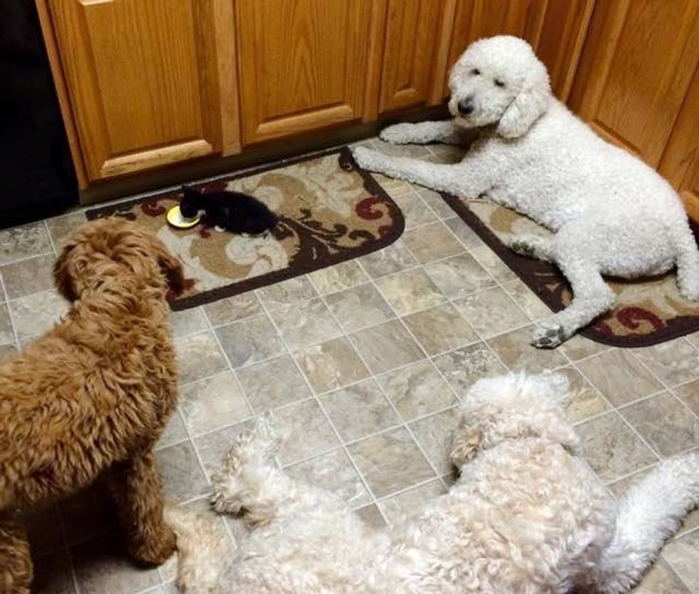 The dogs are patiently waiting till kitten gets done with his kitty milk so they can have the leftovers!