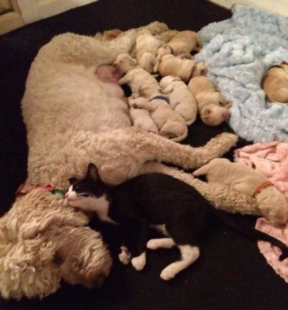 "Our mama dog was very close to delivering her pups at that time and took kitten in without hesitation! He was her baby and remained her baby even through the delivery of her own pups.