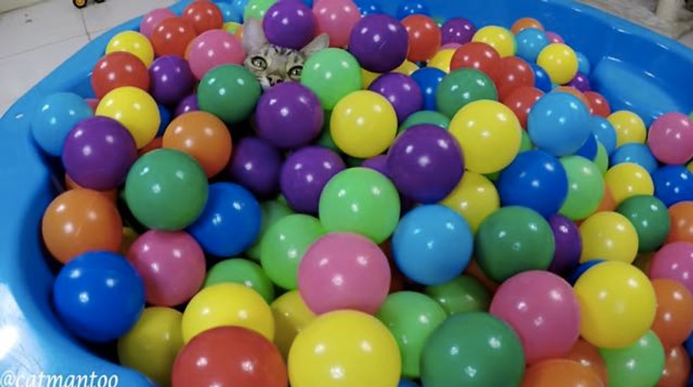 While Boomer's sister Didga the cat isn't a fan of the ball pit at all, Boomer's learned to love it! (Follow them on Facebook)