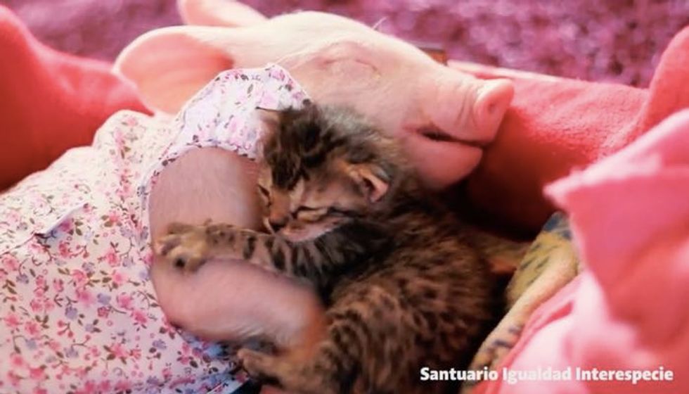 Laura the piglet was rescued from a factory farm and brought to the sanctuary. When they introduced her to little Marina, it was love at first sight.