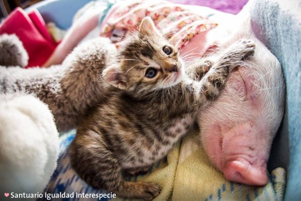 A tiny abandoned kitten found a new sister, a rescue piglet. They share an inseparable bond!