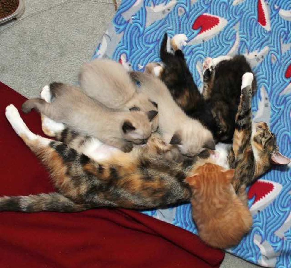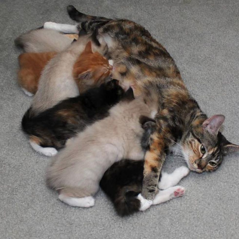 The calico mama devoted herself completely to her kittens. She made sure no baby would miss a meal and kept them clean and well groomed with a lot of baths whether the kittens liked it or not.