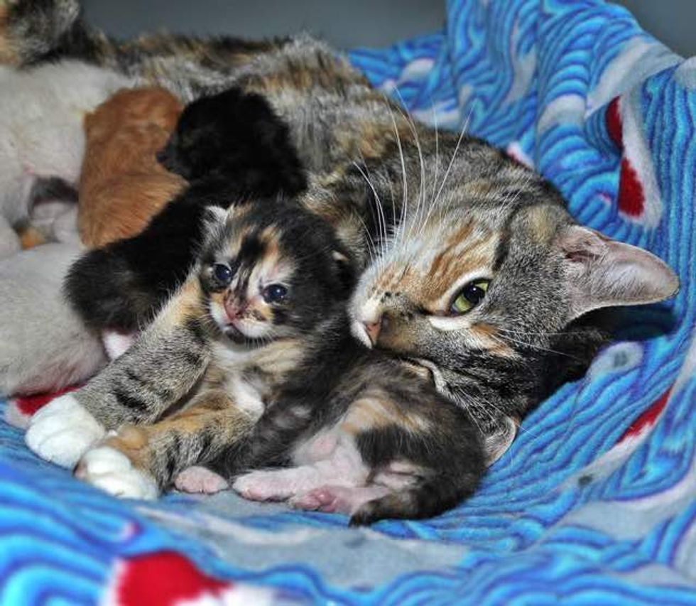 A stray cat with a big belly got herself off the street into a safe place right before she gave birth to her six tiny babies.