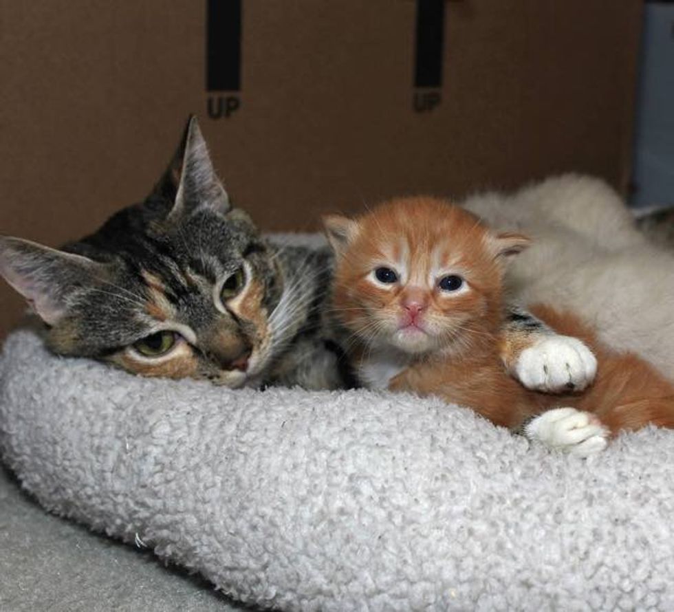Jellybean hugging her baby Taffy. "Taffy was the first kitten to start exploring."