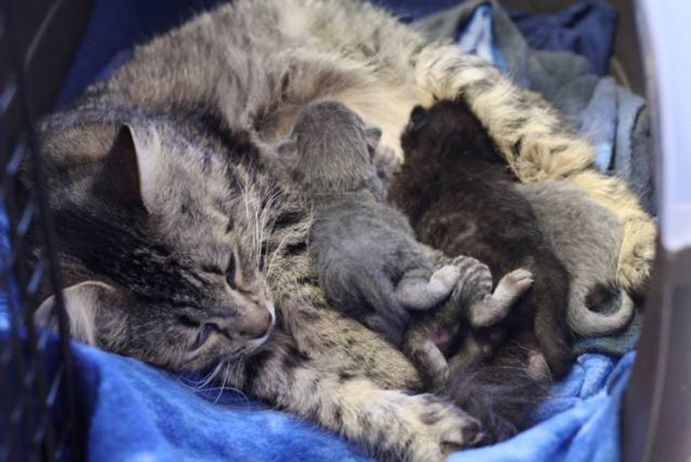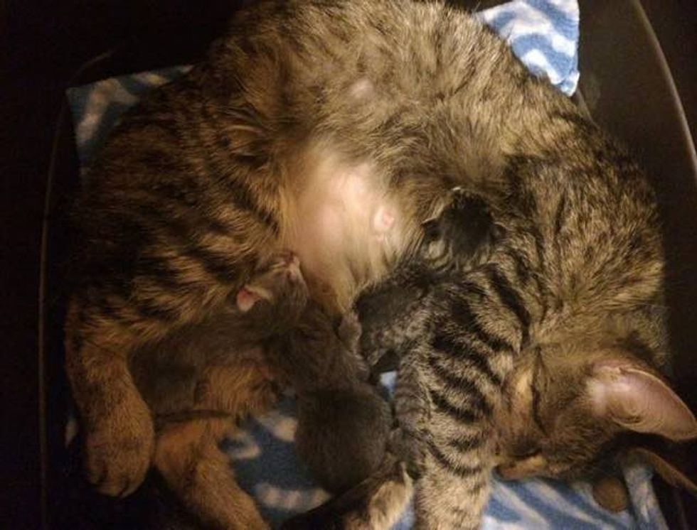 A stray cat with a big belly was rescued hours before she gave birth to her tiny fur babies.