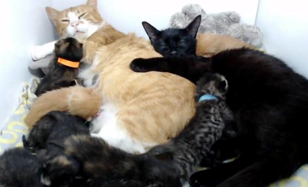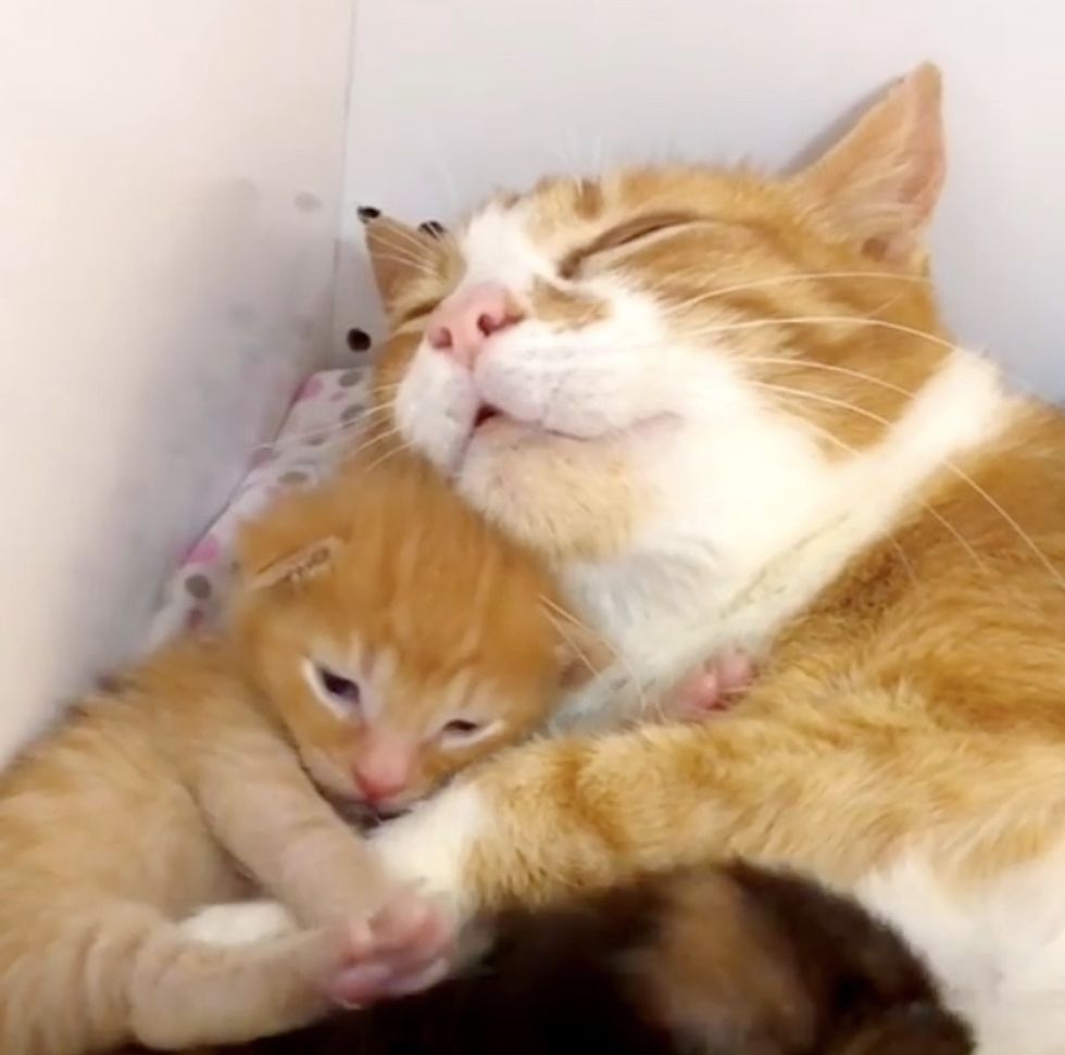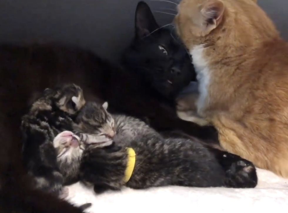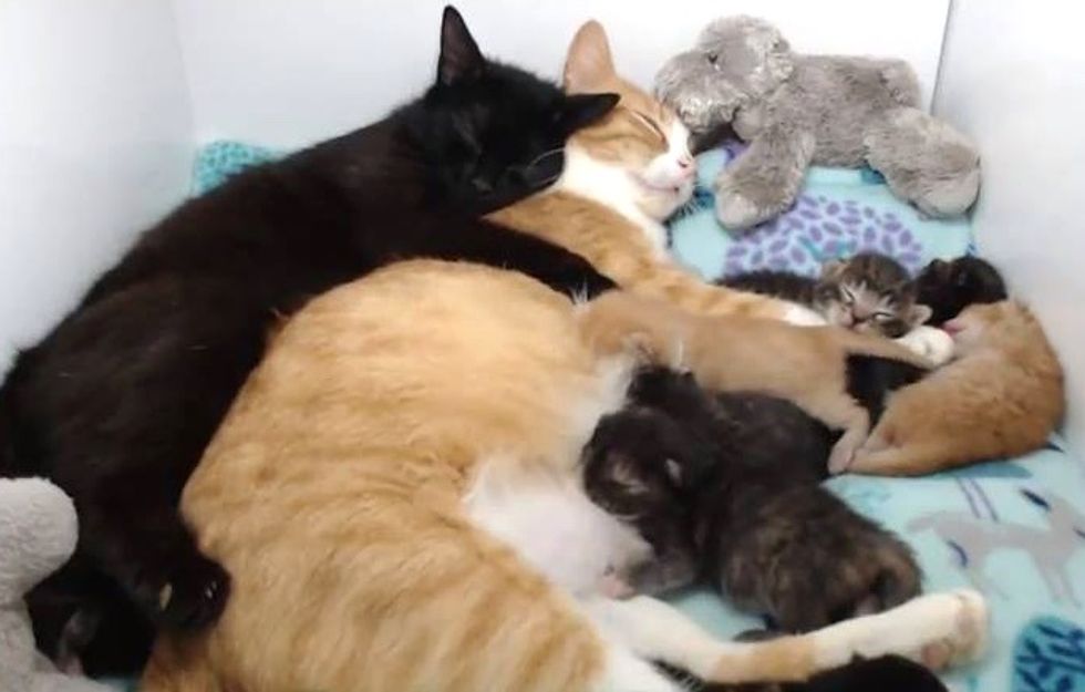 The two mama cats are now co-parenting all nine kittens, sharing responsibility and supporting each other with lots of snuggles.