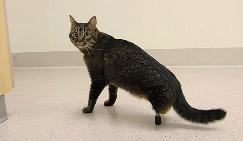 Vincent a three-year-old tabby cat is walking for the first time thanks to a pair of new prosthetic legs he received. Now this kitty is part titanium and 100% awesome.