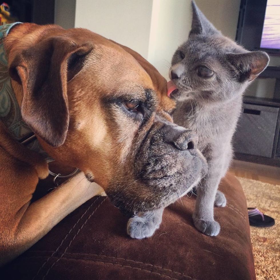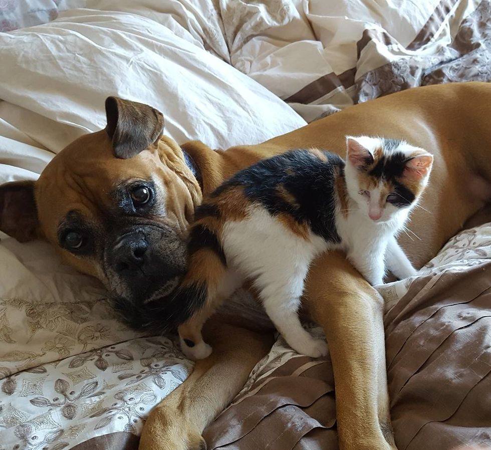 Kushi immediately took a liking to his canine friend and would lick her face and snuggle with her all the time. The kitty had an infected eye that was later removed. Kelly took care of him after he got treatment and had surgery.
