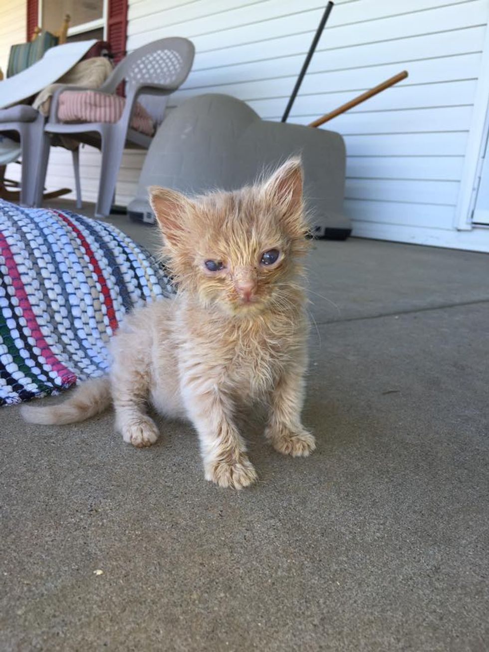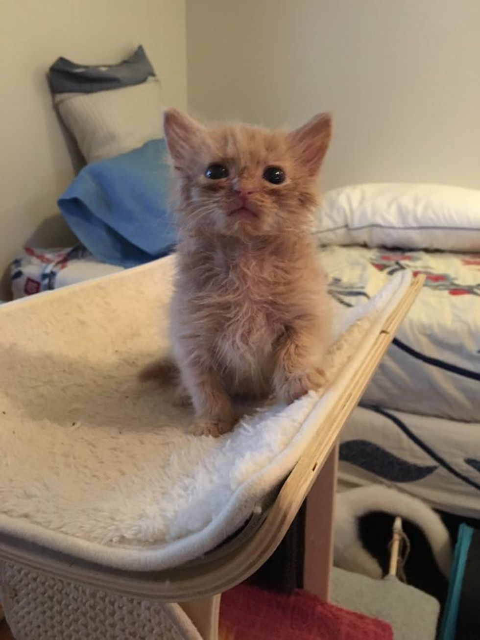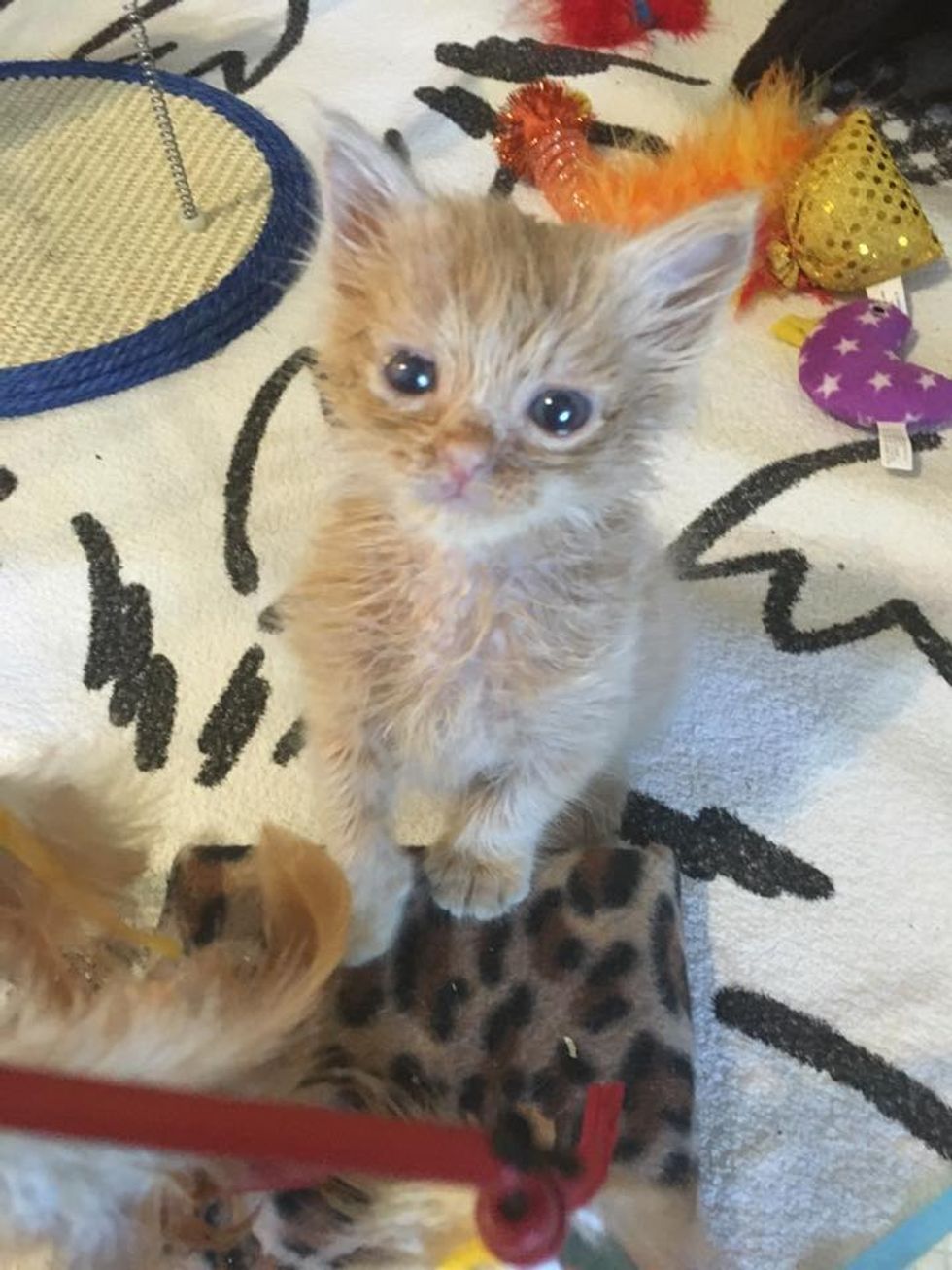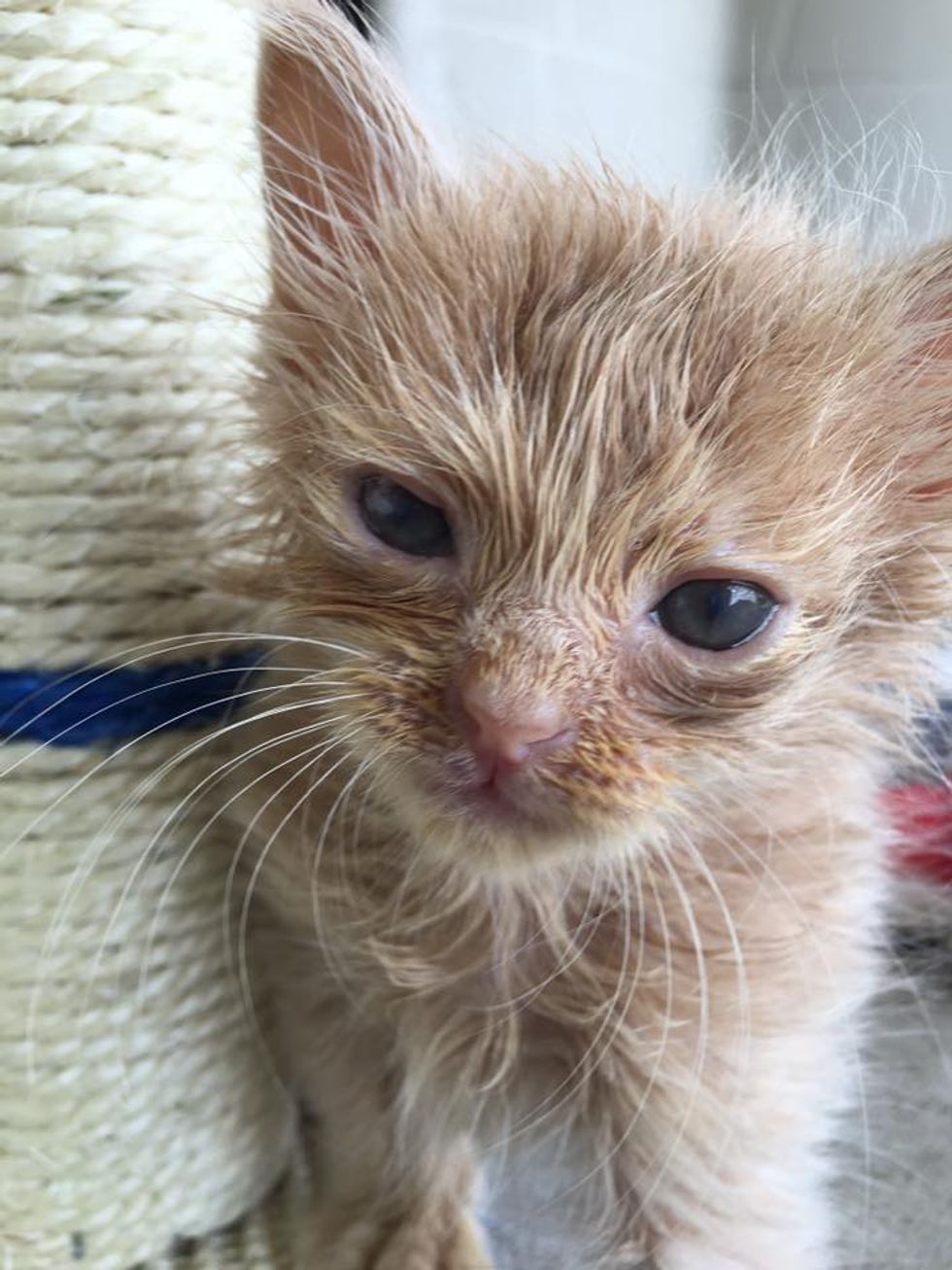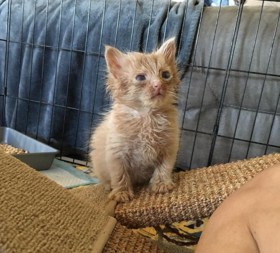 The little ginger boy came with a list of ailments, including pneumonia, and was gasping for air. He couldn't smell his food or see it very well to find it, but the tiny kitten refused to give up.