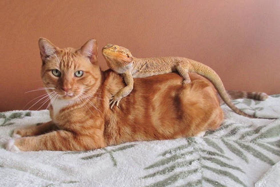 An animal lover took her bearded dragon Zu to a clinic where she was interning at and introduced Zu to a ginger cat named Raun Juan (R.J.). After a brief meet and greet, this happened...
