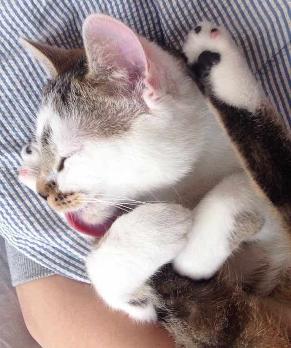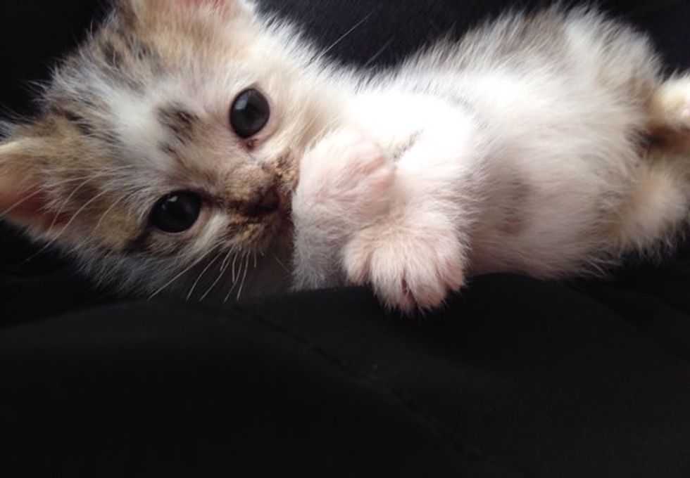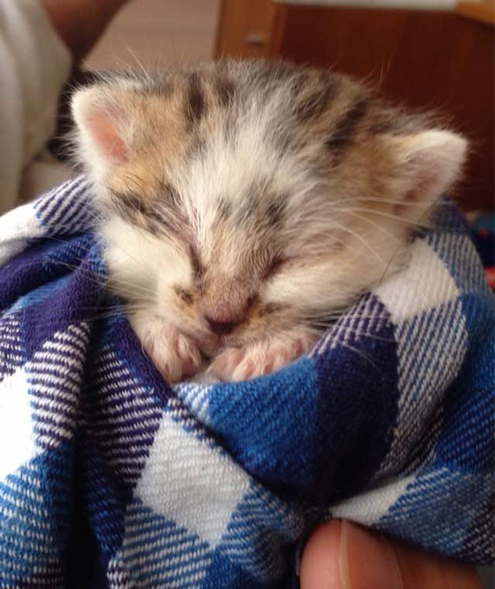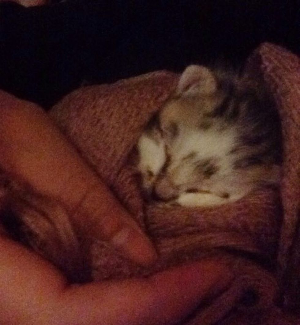 Kitten is finally in a safe home. After a very needed bath, he fell asleep in the blanket.