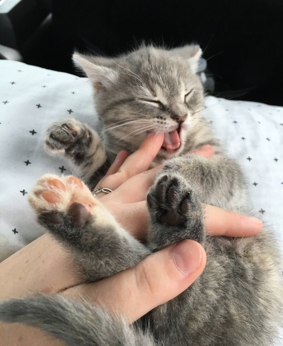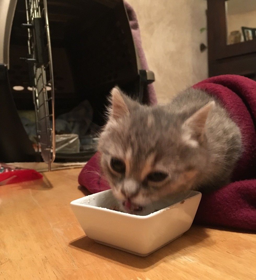 "My girlfriend is visiting an aunt in Virginia who came upon the kitten after a feral mama apparently lost track of her. Our best guess is that she isn't much more than a month old," T. said.