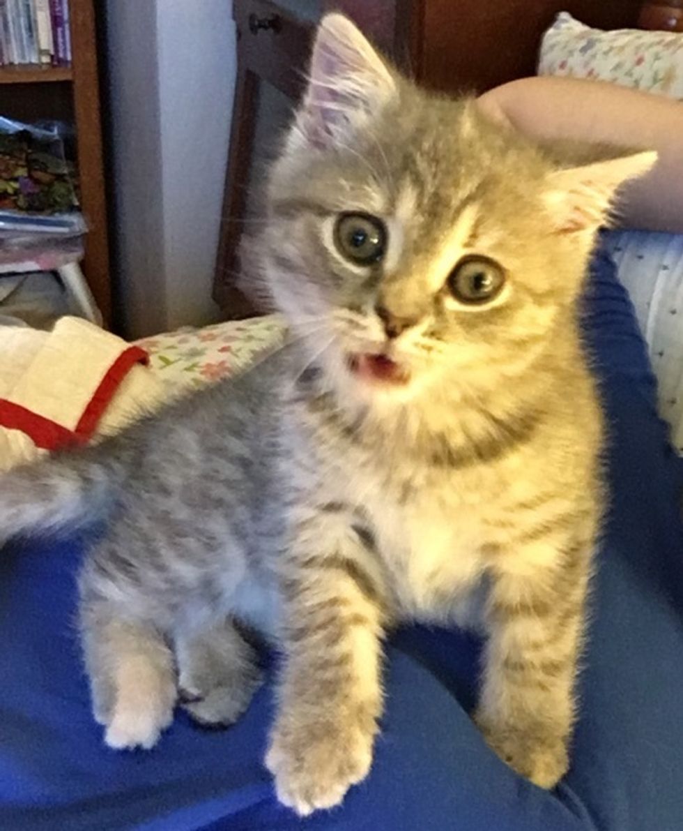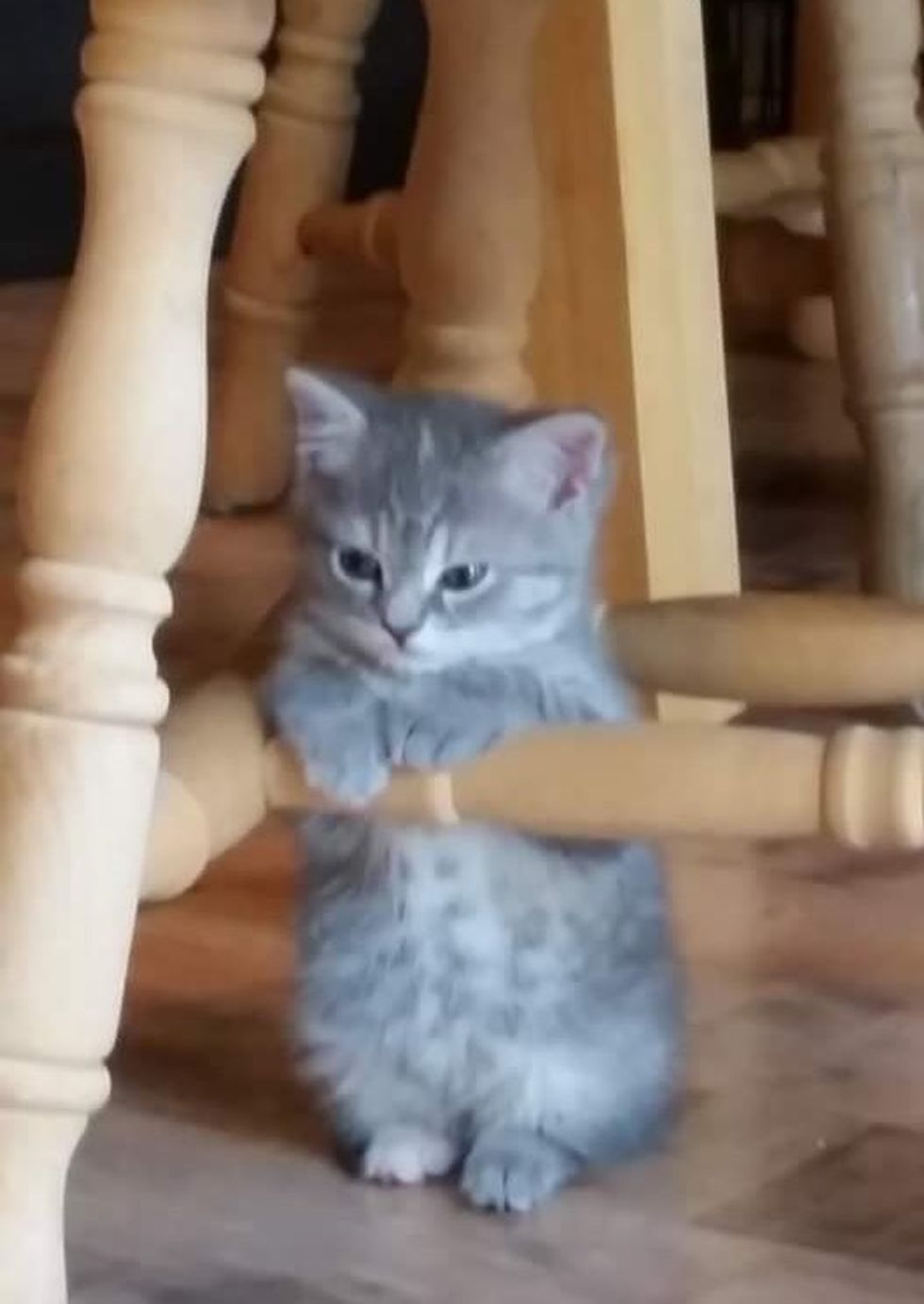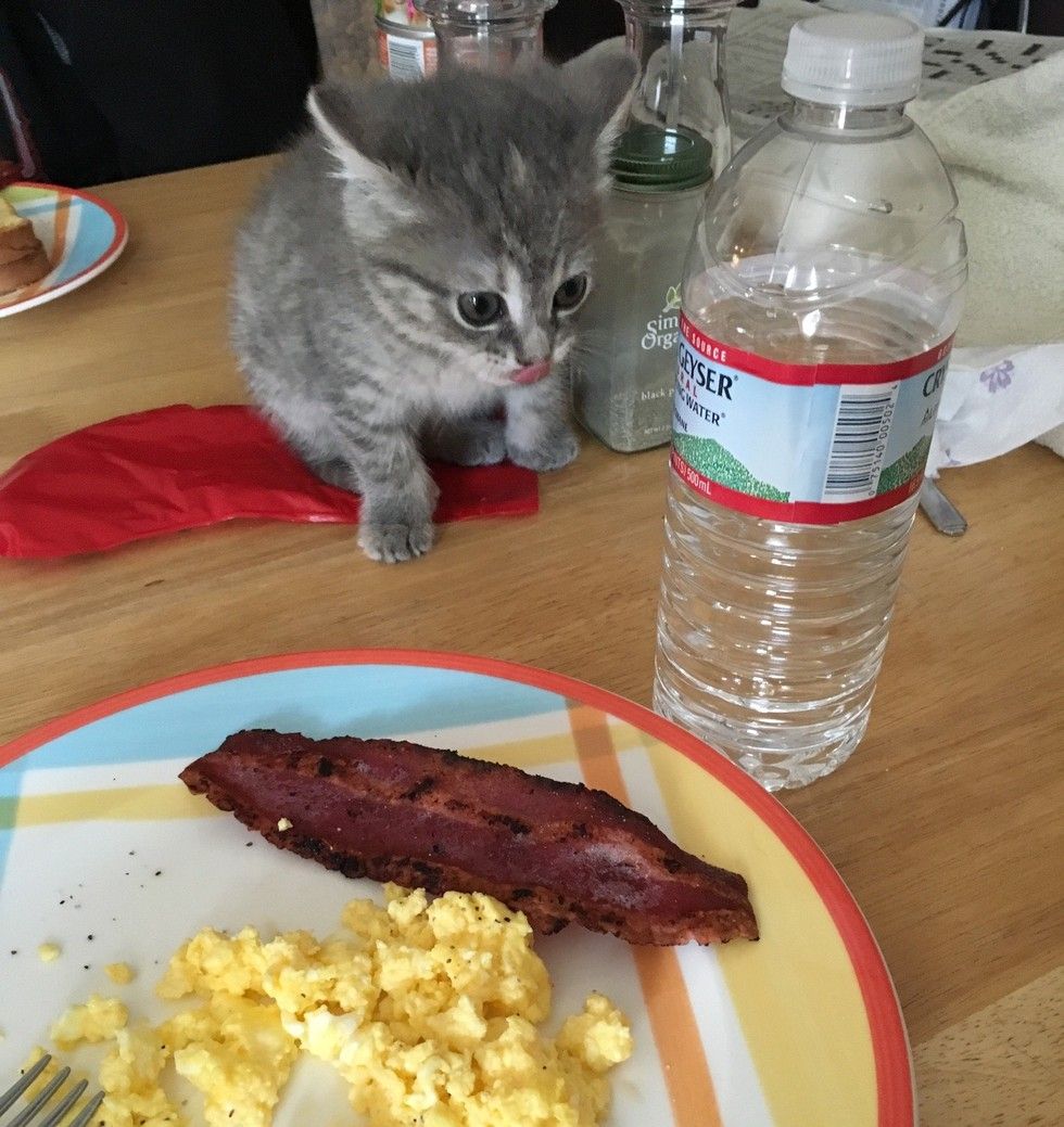 Soon the tiny gray kitty taught herself a very useful skill - supervising her humans when they eat.