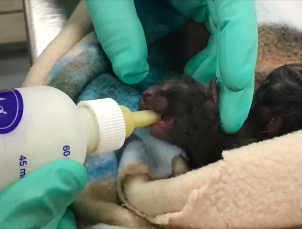 The veterinary team members are bottle feeding the kittens, providing them the necessary nourishment.