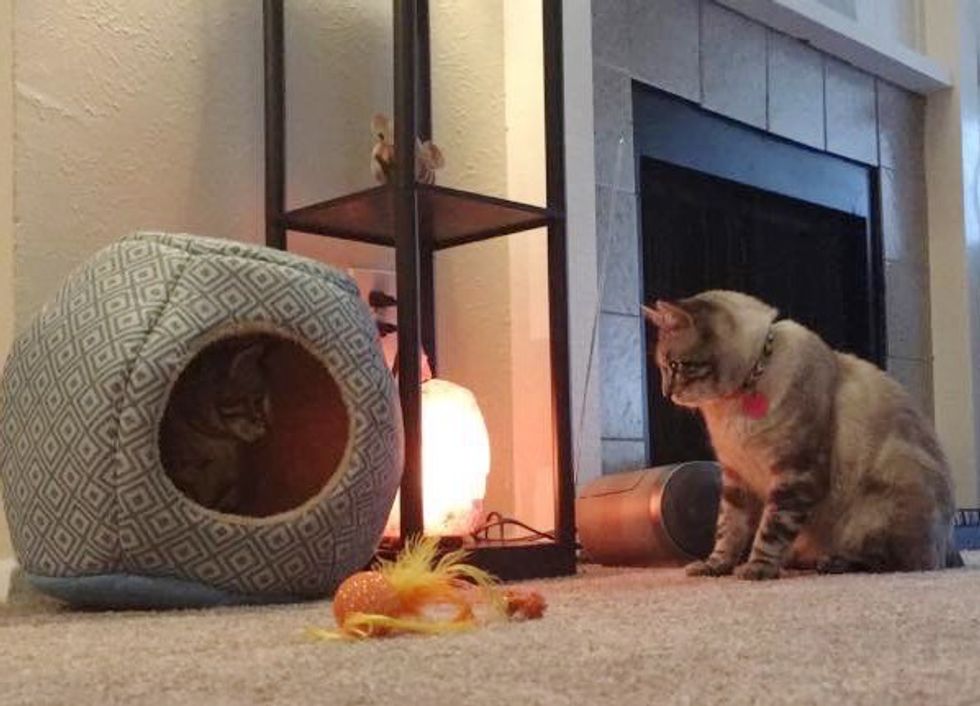 During the first couple days, the kitten kept his distance and wouldn't eat until his food provider was far enough.