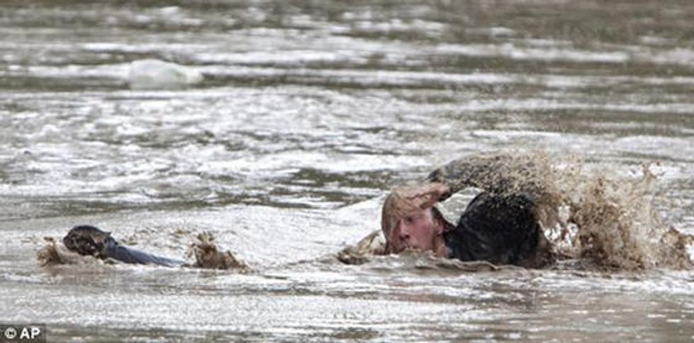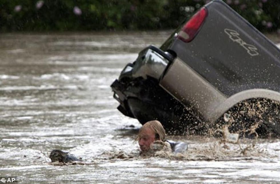 Kevan crawls out the window of his truck with his cat tightly held in his arms while his truck is sinking in flood waters.