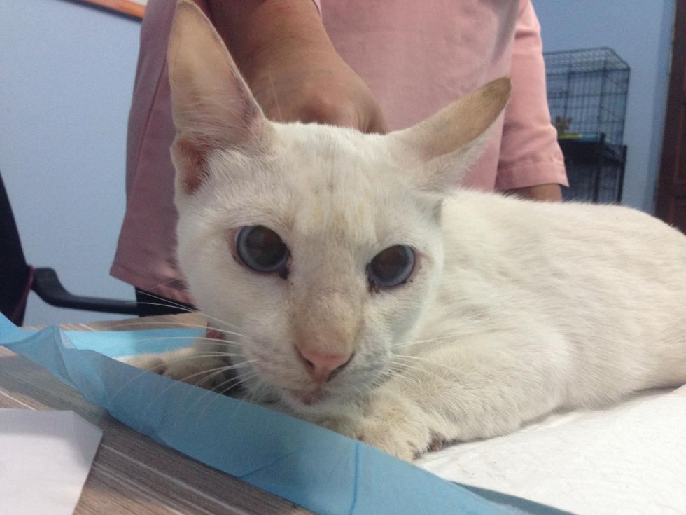 Danga Bay sat in his rescuer's lap, purring up a storm at the vet. He was happy to be safe and loved.