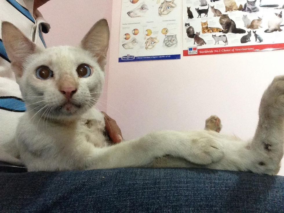 The one-year old kitty was diagnosed with a fracture in his right hind leg and a few cuts on his paws and chest, but the sweet kitty is on the mend.