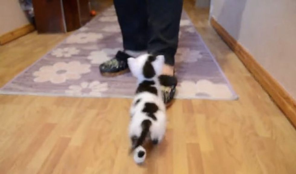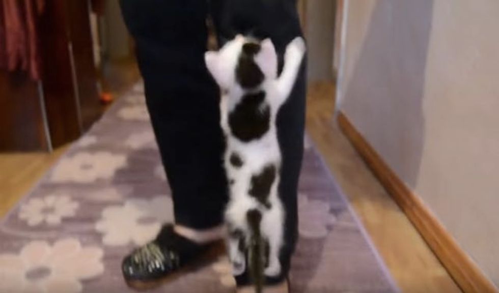 Kittens usually outgrow this leg climbing behavior once they are older. But for now, this little cow kitten will surely climb if she spots a bottle.