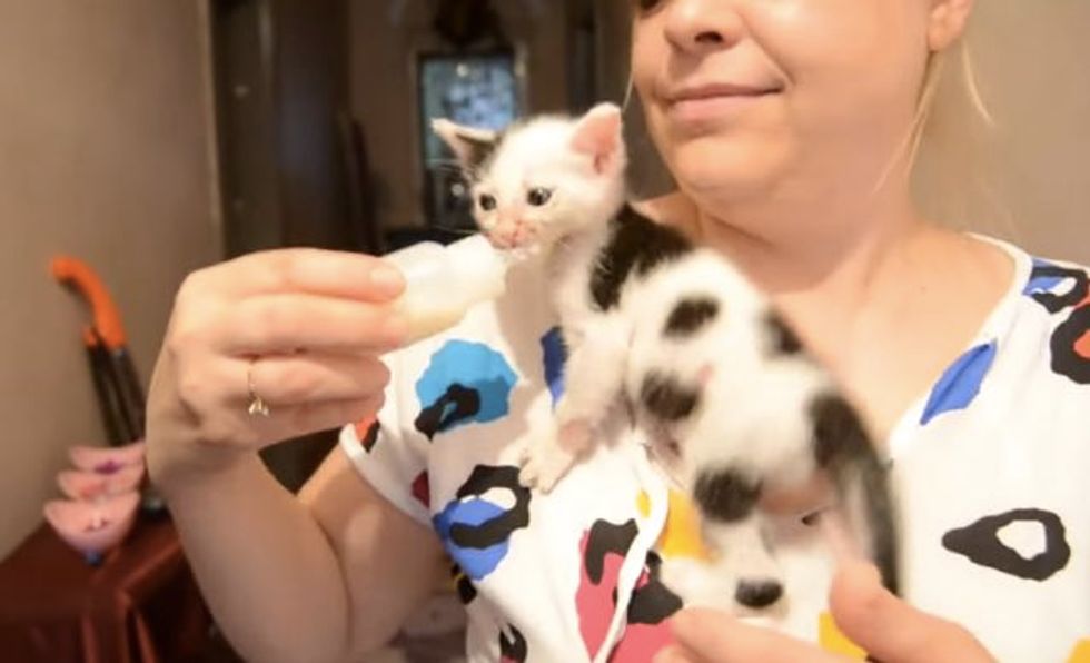 When kittens are little, they demand food like no other, meowing on top of their lungs and sometimes they choose to take matters in their own paws and climb up their caretaker's leg to get what they want. It's never fast enough for these little hungry babies.