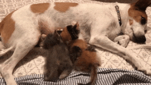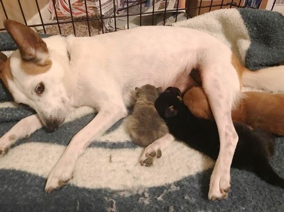 They were worried that the kitten might have trouble nursing alongside the puppies because they were much bigger, but the little feisty kitty surprised them by pushing the puppies out of the way to nurse.