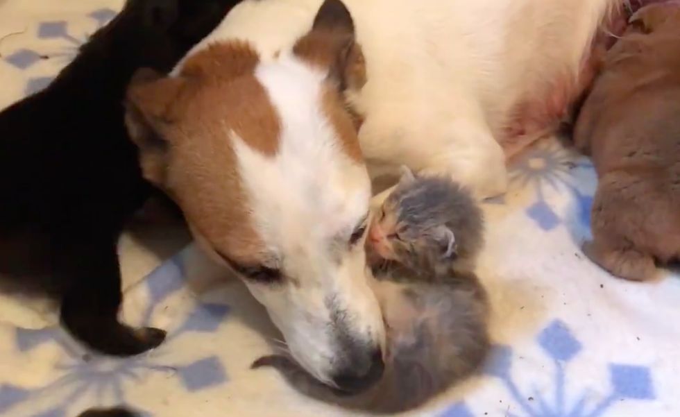 She placed the kitten in the nursery pen, and immediately Pirate took to the little feline baby and started caring for her. "She was happy to accept a new baby, and the puppies seemed to think their new littermate was perfectly normal."