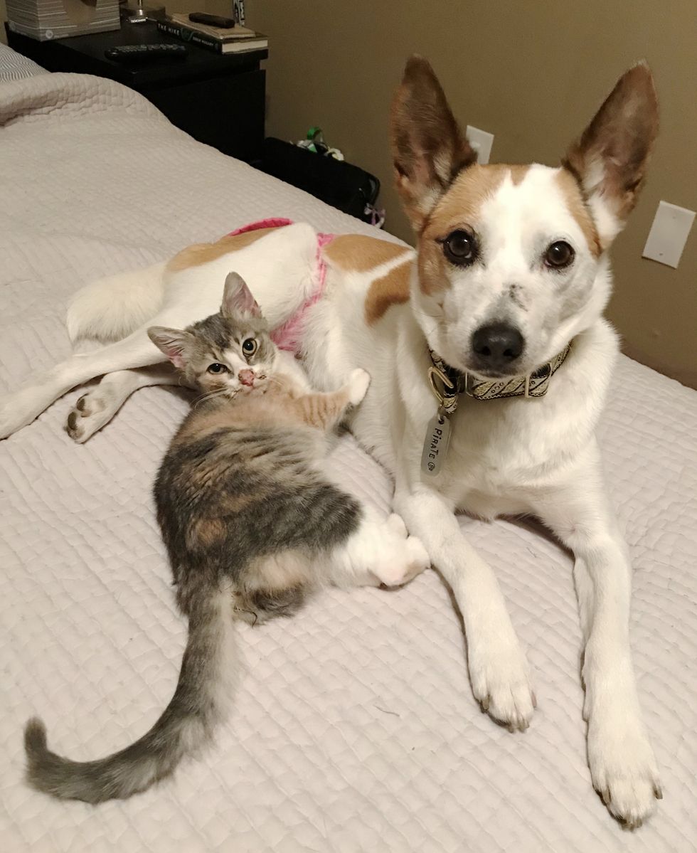 Pirate is very nurturing to animals in need and has helped foster numerous pups and kittens. When Gabi brought home a little calico, she immediately offered to mother her.